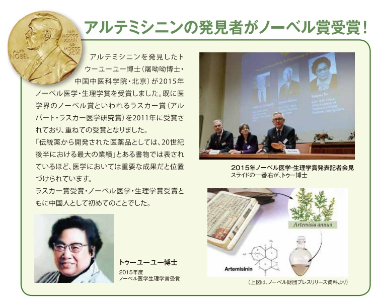 アルテミシニンは中国では古くから解熱剤などとして用いられていました。現在はマラリア治療薬として世界中で使用されています。そして近年、ドラッグリポジショニングの観点からアルテミシニンに抗がん作用があることが多くの研究で明らかになっており、欧米・国内の医療機関でがん治療薬としての治療効果を上げてきています。2015年にはアルテミシニンを発見したトウ―ユーユー博士がノーベル医学・生理学賞を受賞されました。